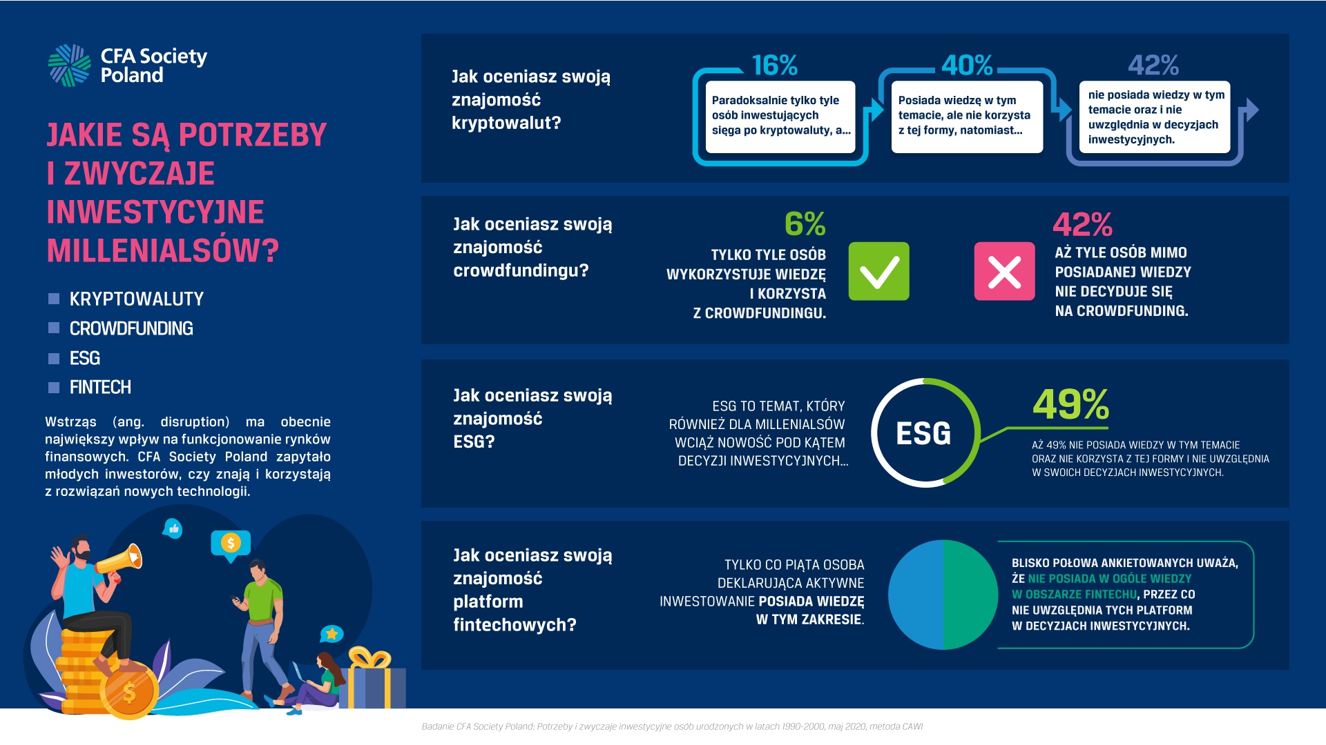 Tylko co trzecia osoba urodzona pomiędzy 1990 a 2000 r., będąca częścią pokolenia millenialsów, aktywnie inwestuje swoje środki finansowe – wynika z badania przeprowadzonego przez CFA Society Poland wśród studentów uczelni wyższych w maju 2020 r. Młodzi inwestorzy – mimo rosnącej mody na "bycie eko" – nie posiadają wiedzy nt. koncepcji inwestowania w spółki, dla których środowisko, społeczeństwo i ład korporacyjny mają istotne znaczenie.
