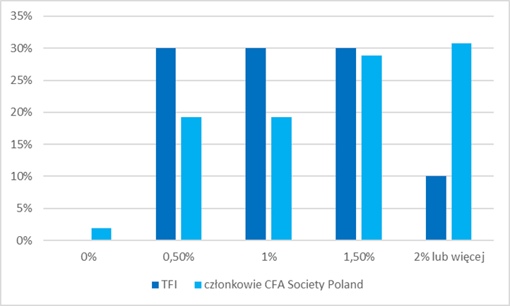 Zacznijmy od TFI. Żadne z zapytanych przez nas towarzystw nie stwierdziło, że stopy procentowe są tu, gdzie być powinny. Dalsze odpowiedzi podzieliły się mniej więcej po równo – jedna trzecia uważa, że stopy powinny być w okolicy 0,5 proc., tyle samo – że w okolicy 1 proc., a reszta – że 1,5 proc. lub więcej. Średnia zatem kształtuje się 100 punktów bazowych wyżej niż obecnie!
